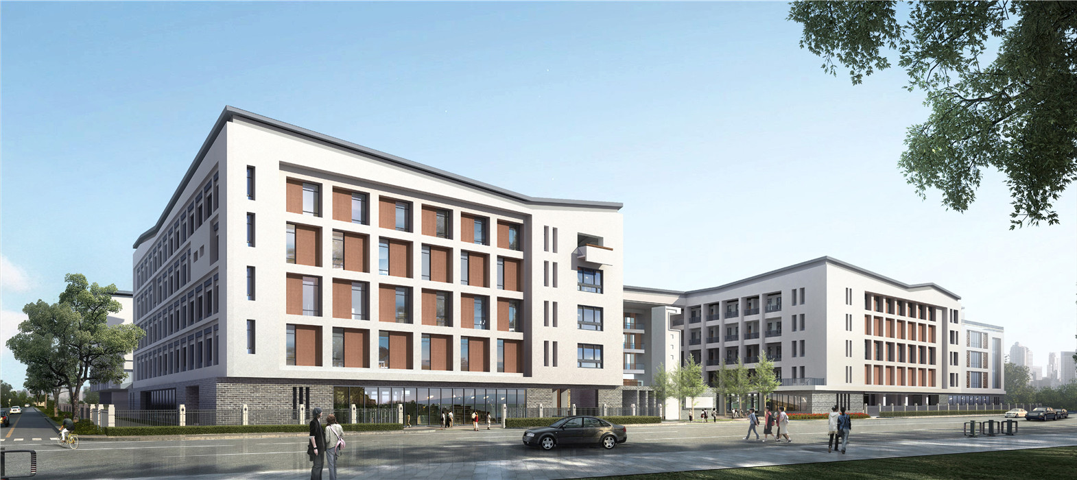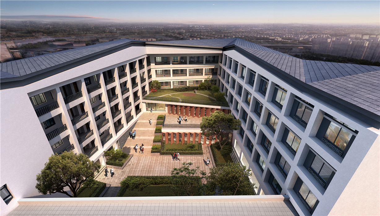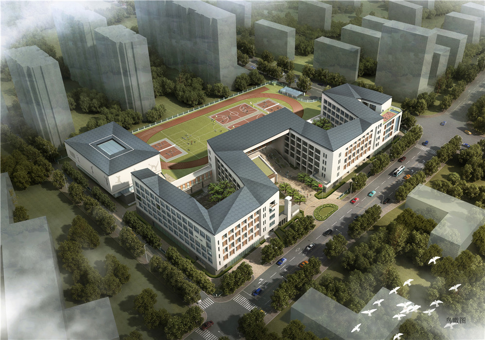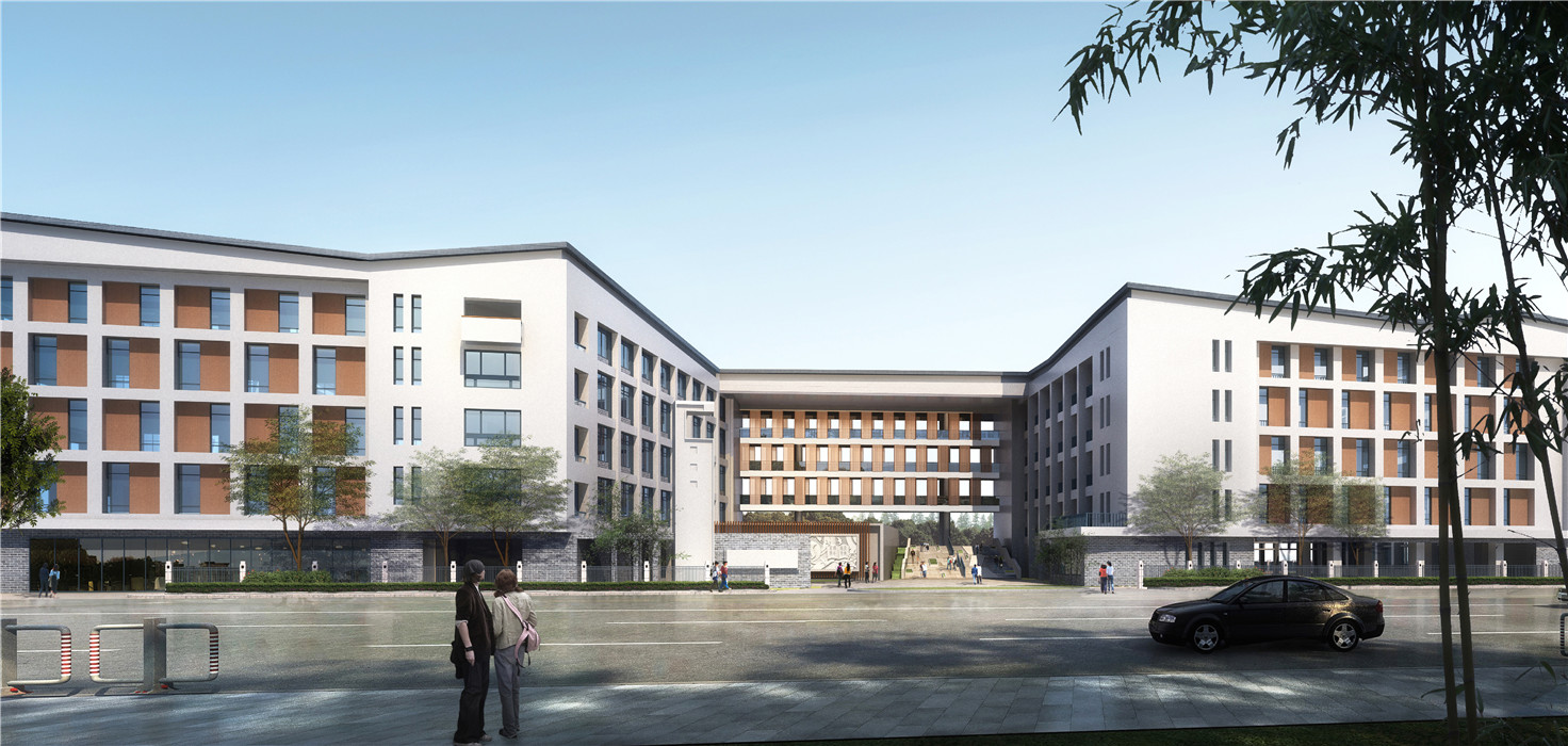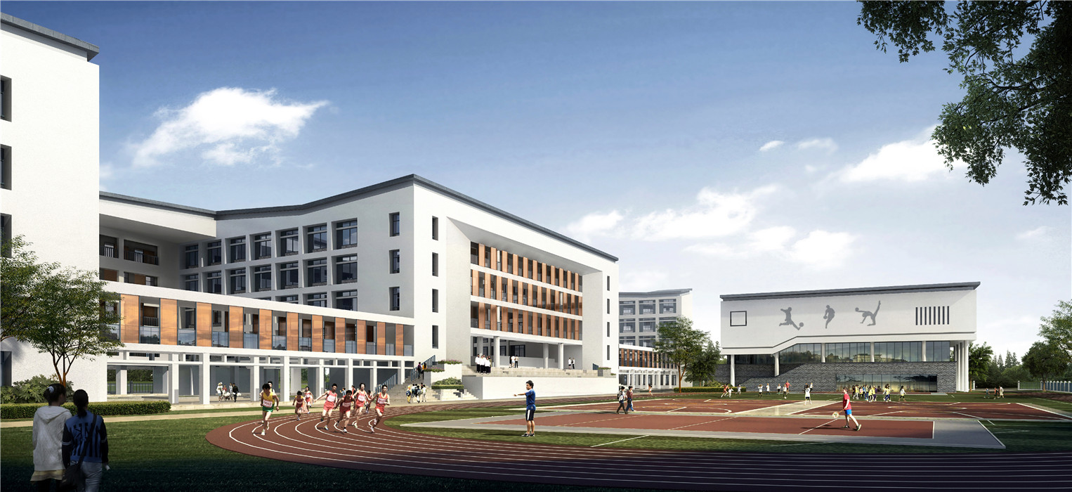 江干区历史悠久,毗邻运河与钱塘江,是杭州最古老的城区之一。项目以江干区的大环境为背景出发,旨在创造一个具有江干历史记忆、融入运河与钱塘江文化的现代校园建筑。设计以“运河之水、钱江之潮”的建筑形式为主题,运河之水的肌理通过演化形成一条自由贯穿的建筑形式;钱江之潮的气势让我们联想到了连续起伏的折板屋顶。建筑整体自由动感,现代大气,体现当代校园朝气蓬勃、活泼开放的精神面貌,符合城东新城 “精致和谐、大气开放”的区域形象,极具杭州文化特色。