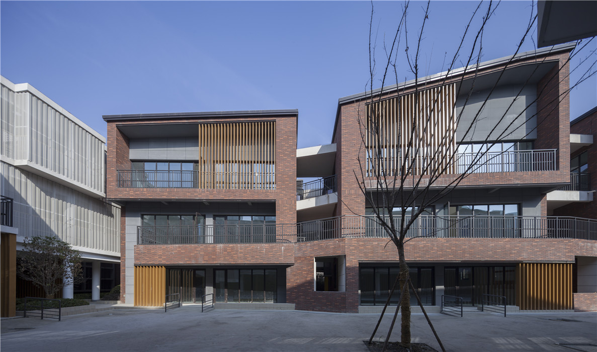 分散的建筑体量以坡顶形式协调整个地块立面风格的同时,形成坡顶小屋聚落的形象。主要材料采用红砖墙面,给人温暖触感与经典的建筑印象。搭配原木色通透构件增强建筑亲切感。局部采用空斗砖砌筑,形成通透的建筑表皮。