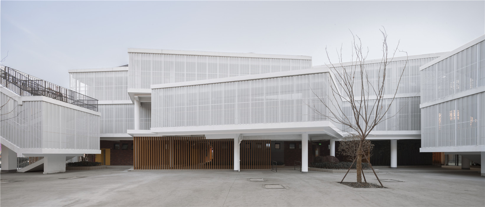 引入江南园林空间特点,整体布局倾向于分散式。六个活动单元体量、两个辅助功能体量及一个音体活动室体量分散布局,通过连廊串联。错动的建筑体量与曲折的廊道形成丰富的公共空间,为小朋友提供充满趣味的空间体验。游走连廊的过程的过程步移景异,形成如游园般体验。