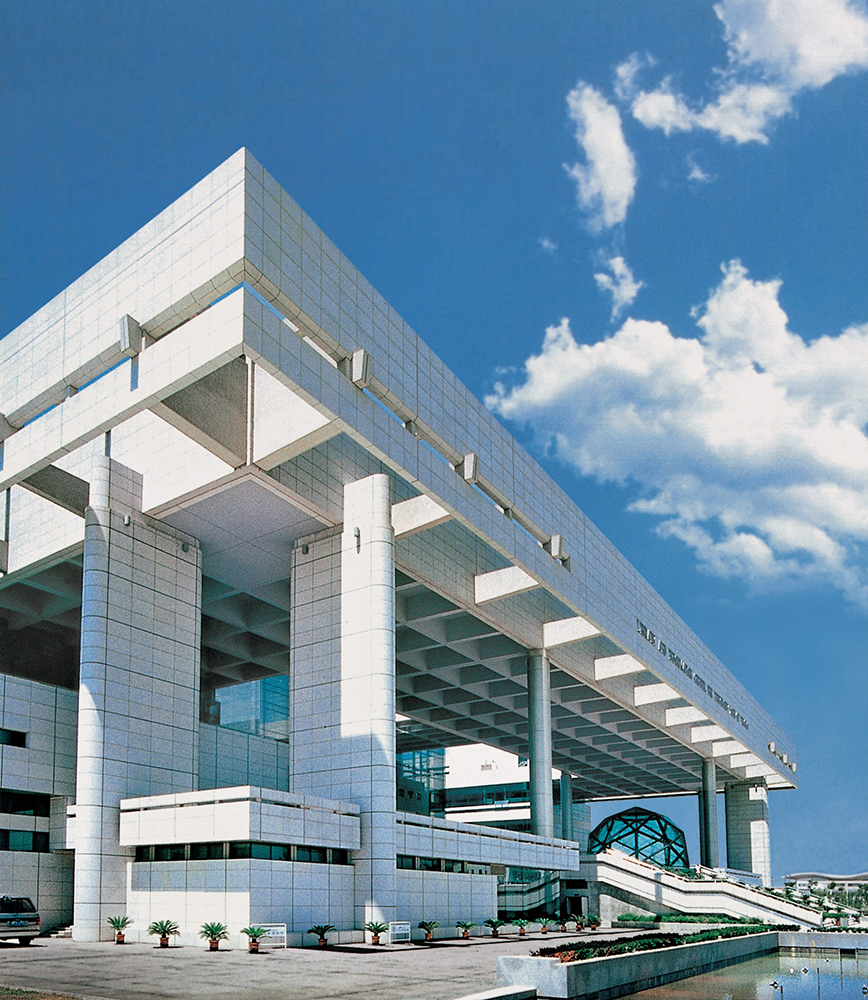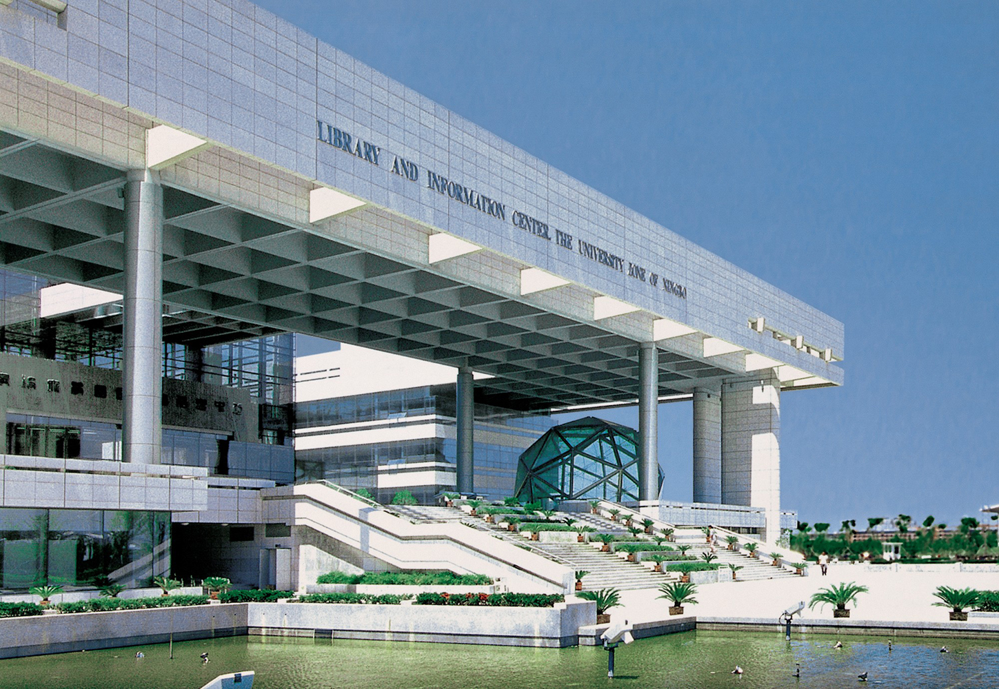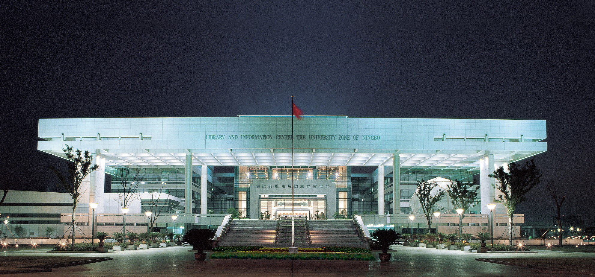 基地位于宁波市高教园区南端,其东北及东南方向分别为学院密集区,西北方向位于宁波市区。因此,总平面及出入口布置充分考虑了上述方向的人流出入的方便。总平面还考虑全方位的景观要求,在建筑三面布置水景,并将水面引入建筑内部,大面积的大面与前塘河及基地内的大片绿地构成幽美宁静的环境。建筑为“凹”形平面,各类阅览室围绕庭院布置,入口处以五层通高的柱廊相连,内外空间互相渗透、开敞而空灵。通体透明的中央检索大厅的设置,突破了“三合院”的格局,空间变化更显丰富。建筑平面及造型整体纯净,但不乏细微的变化,使图书馆建筑在展现其开放性和公共性的同时,有较高的文化品位。建筑的外立面以流畅展开的水平线条体现简洁与纯静的特征,材料采用浅灰白干挂花岗岩及低辐射中空玻璃,色彩淡雅而有现代感。馆内采用智能化综合布线,扩大多媒体及电子阅览室等方式进入数字图书馆时代创造条件。