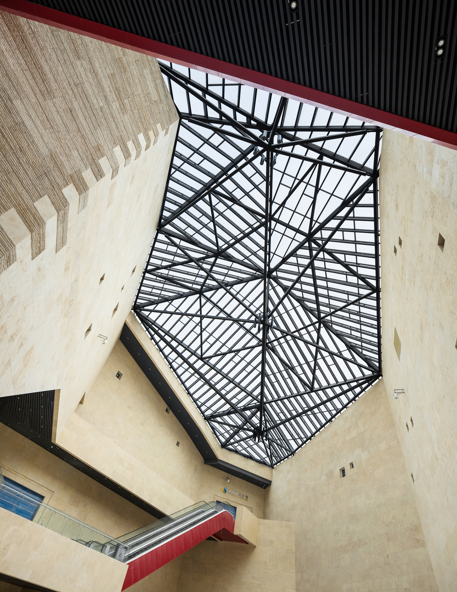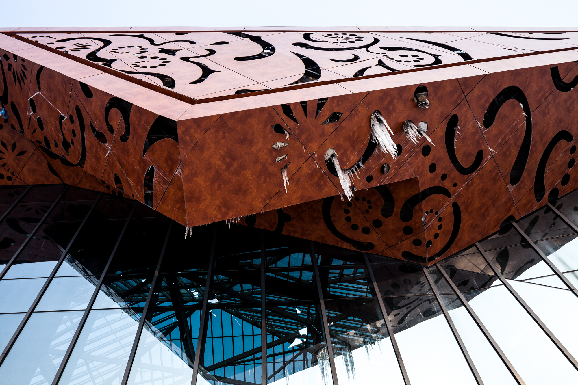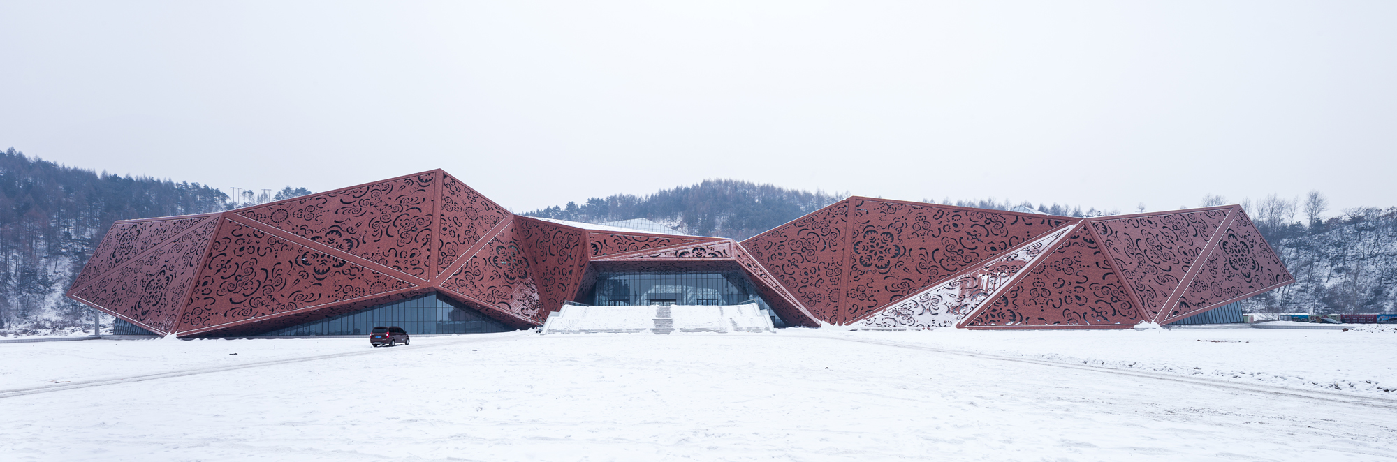 “人与空间”的互动是设计的另一重点,这是一种充满视觉激情的互动美。多折面的建筑完整而富于力度,实体、虚体穿插的晶体造型又宛如刚被开采出的璞玉。以通化当地的满族特色剪纸为母题的镂刻金属外立面以一种文化通感的方式、用迷幻的光影震撼地感染每一个来访者。