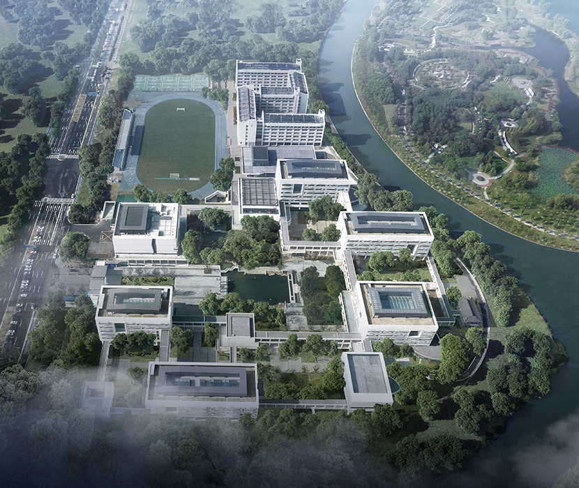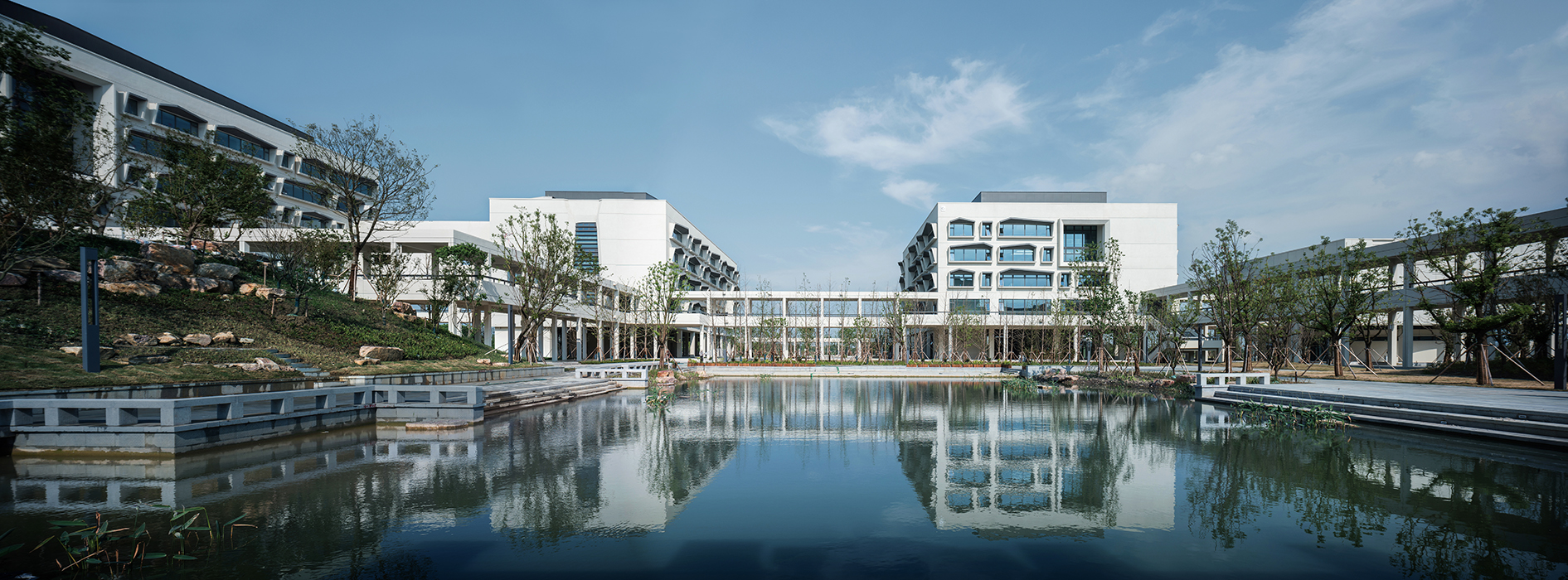 项目位于吴江太湖新城,总用地面积约150亩,总建筑面积90307.9㎡,其中地下建筑面积为17118.5㎡,地上建筑面积为73189.4㎡。学校规划总规模约46个班,学生总数控制在1500人以内。学校紧邻苏州市吴江区胜地湿地公园,场地现状为生态湿地,环境优美水系交汇。