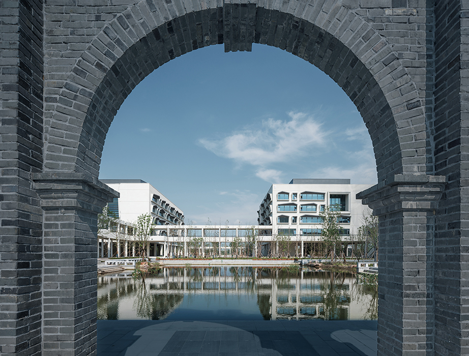 整个校园动静分区明确,各功能建筑连贯整体的气势与交织的共享平台共同构成有机的整体。整体构架可分为“一网、四组团、多庭院”。