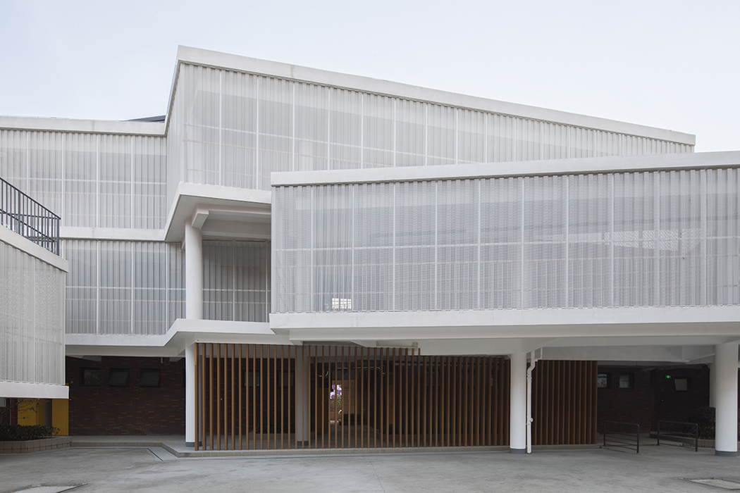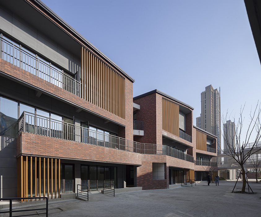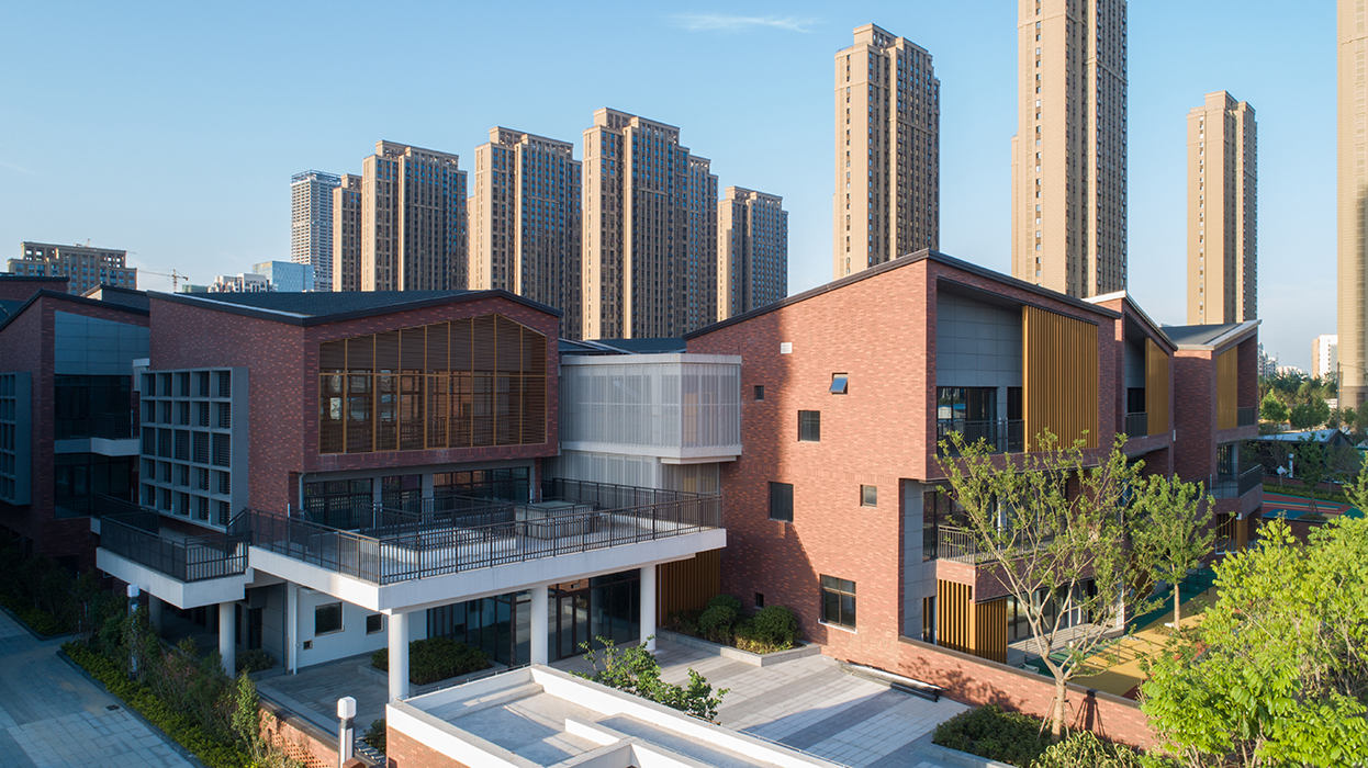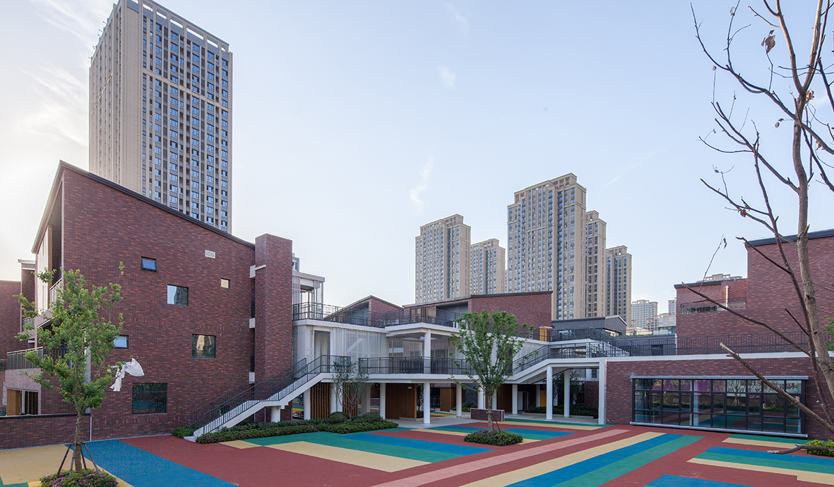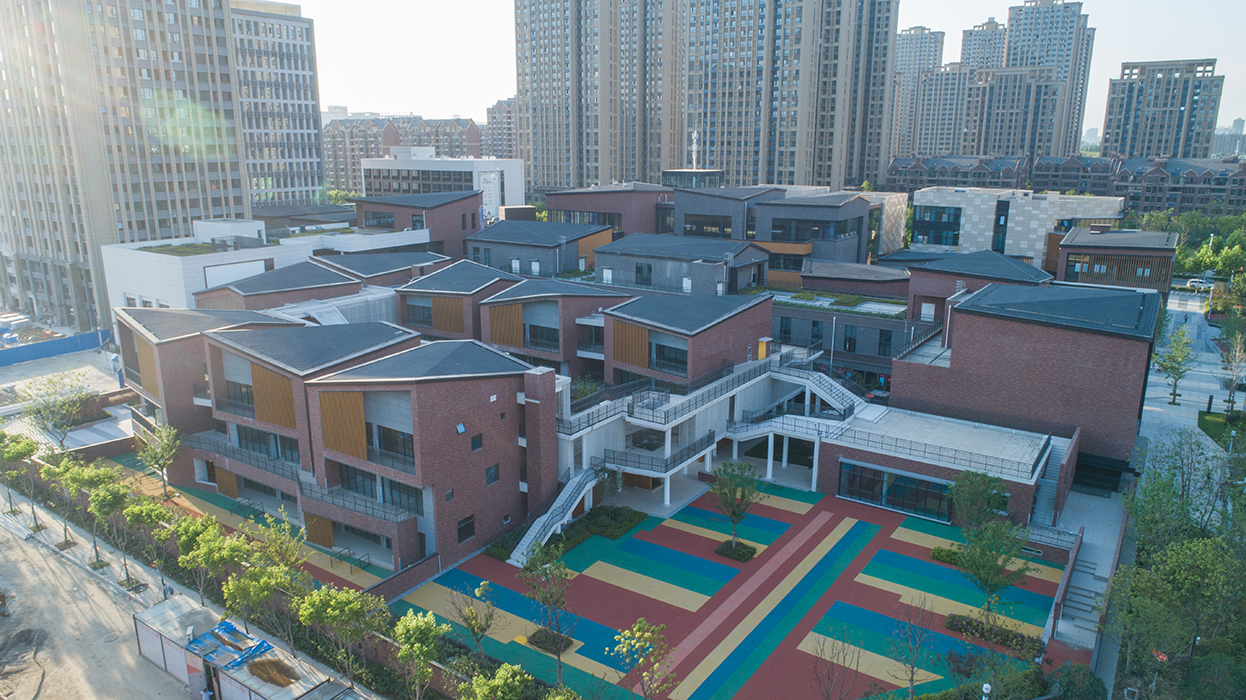 合肥信达天御幼儿园,位于整体规划中邻里中心地块东南角。平面布置摒弃紧凑型布局,建筑按功能分成八个体量,适当拉开距离以不同角度散落于基地内,形成小体量群落。体量间以变化的廊道若即若离地串联成整体。以此空间形式创造出丰富多彩的庭院空间与半室外灰空间,串接的廊道成为有趣的游走路线。借此给予孩子们关于中国园林化城市的启蒙认知。