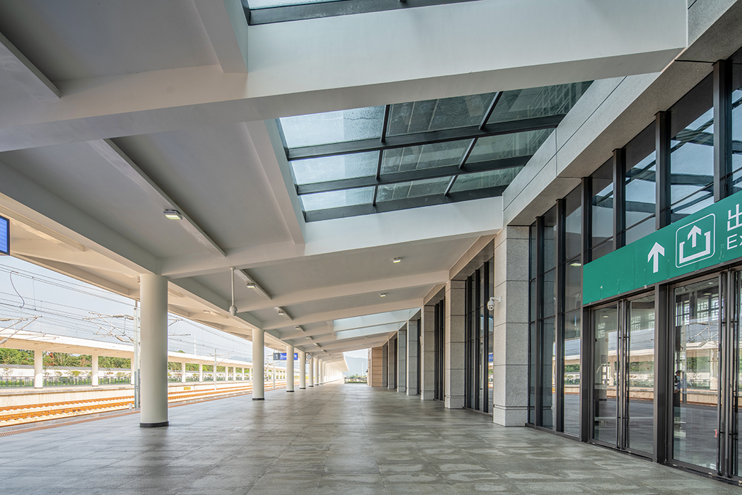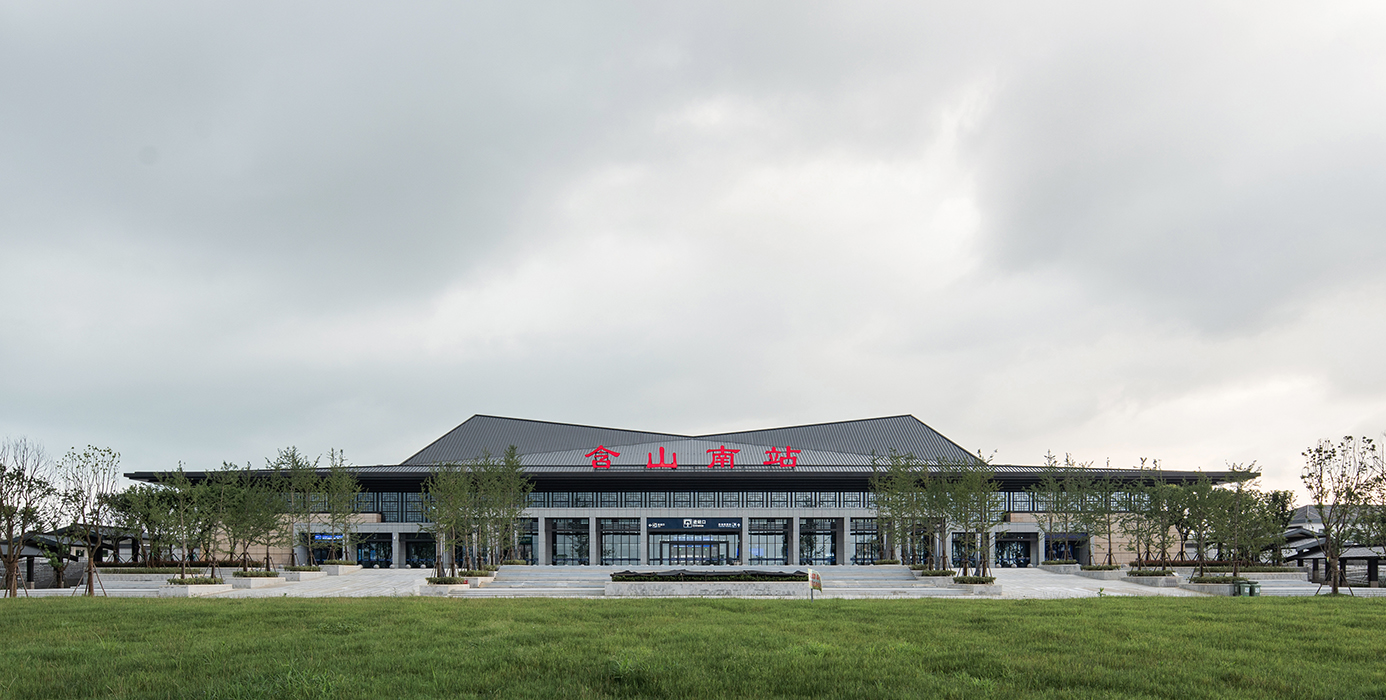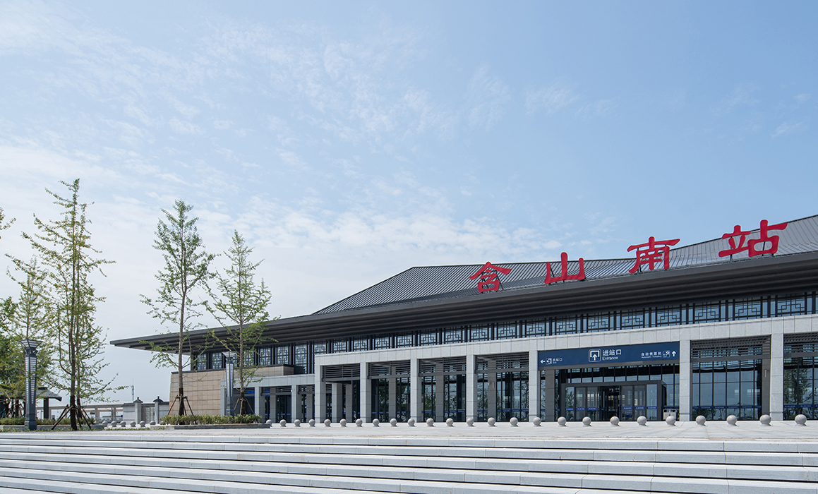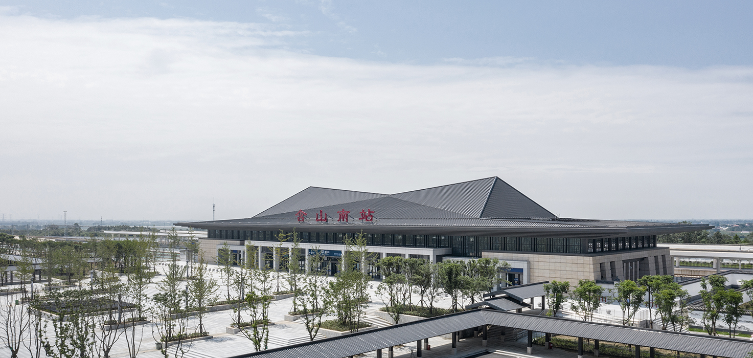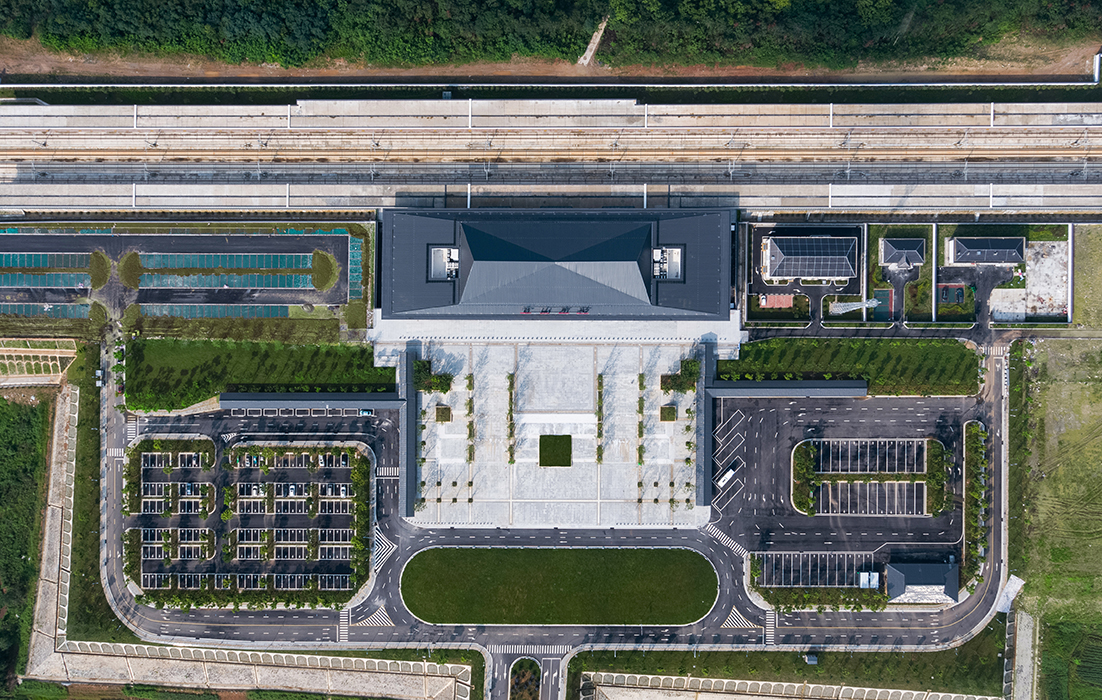 概念来源于本案所处的铜闸古镇和凌家滩文化遗址的古文化背景,以舒展的大屋顶呼应当地的历史文化,以中间高起的折线屋顶呼应周围山势。形体上借鉴古代建筑的柱廊形式,以大虚大实的立面对比强调建筑的体块关系,建筑形体既简洁大方,又不失地域特色。通过增加历史图案的构件来丰富立面,增加虚实之间的层次。整体造型舒展恢宏,体现了高铁站的速度和含山县的历史文脉。