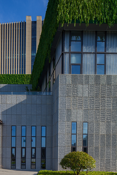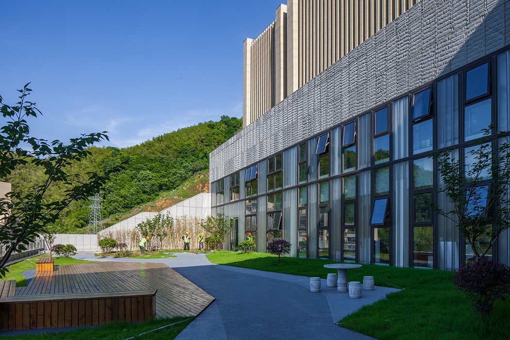 设计从场地大环境着手,充分利用废弃的采石场,依山就势,顺势而为,设计以“层峦叠嶂、轻云出岫”为设计理念,让建筑融于环境,呈现出独特优美的地域性。合理规划功能布局,将垃圾运输、卸料等工艺性生产用房设于西区,而服务于生产用房的水工区、办公以及宿舍设于东区,设计充分利用现有地貌条件达到节能、节地,节约的目的,并且对采石场岩壁和建筑墙面进行垂直绿化处理,让建筑和环境融为一体。