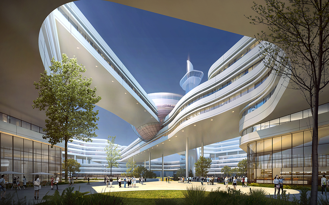 建筑造型中采用架空和退台等手法,在满足各层对于开放空间的需求同时,使大楼在整体中富于变化,体现工科严谨中透着浪漫的特点。增加的这些内庭院、室外露台以及屋面空间,为师生提供多重交流平台和各类活动空间,身处其中,仿佛漫步云间,独特的体验有助于激发师生灵感。