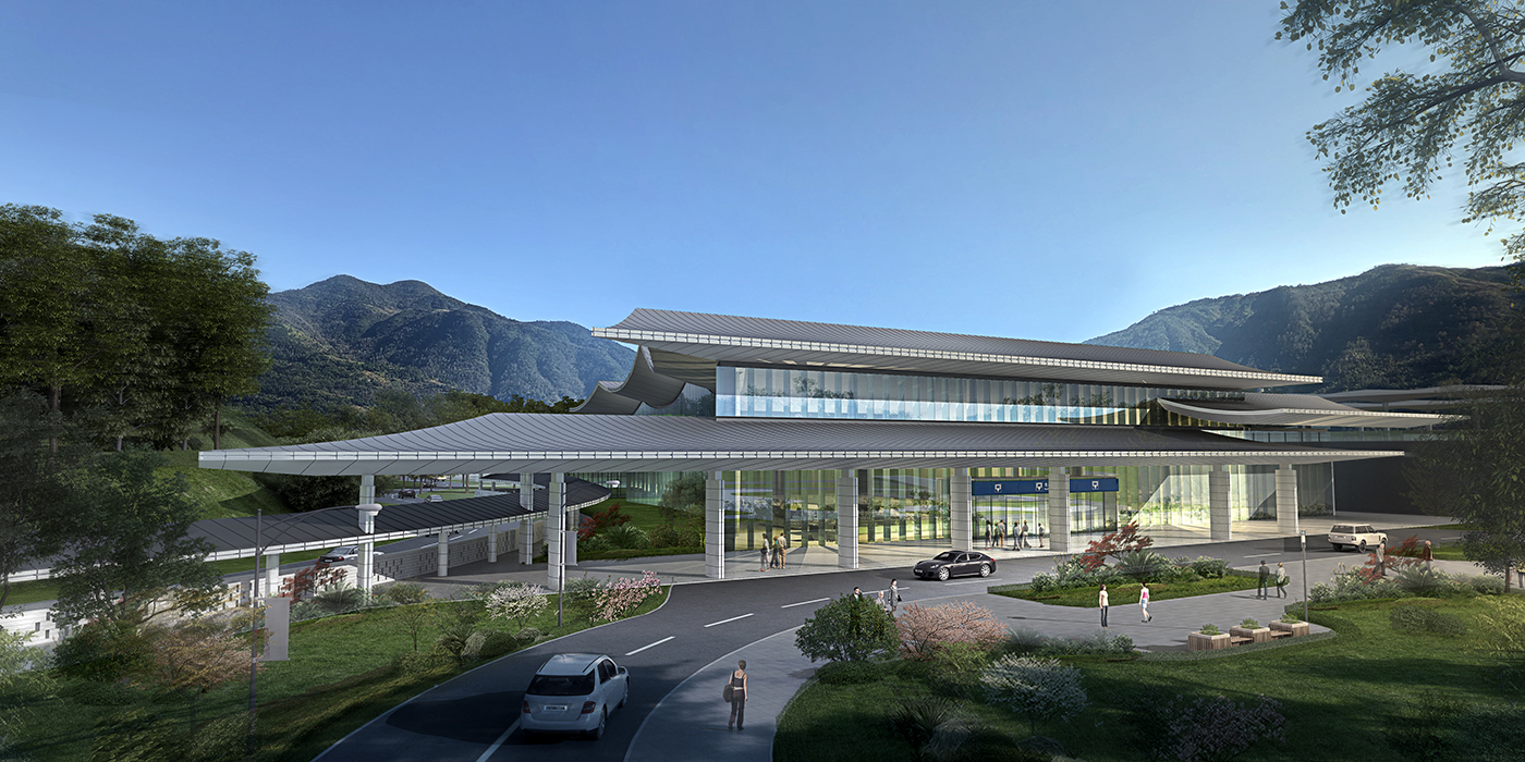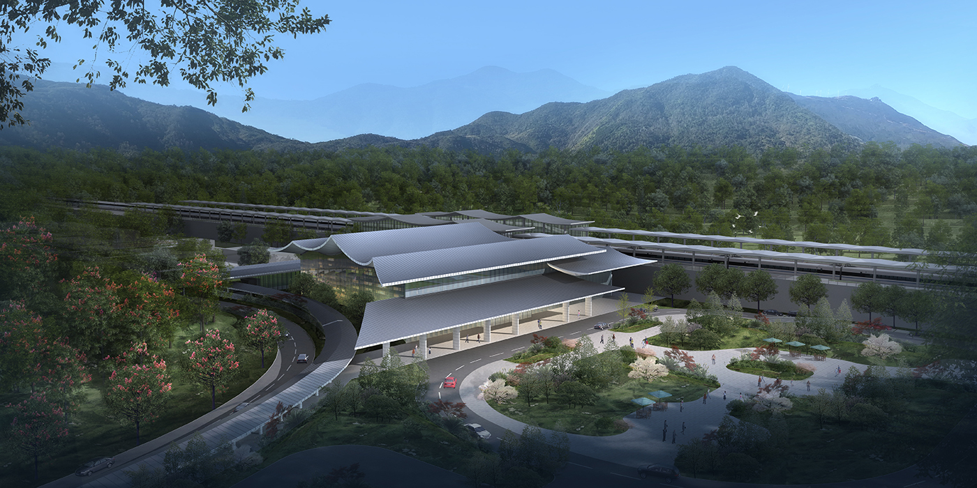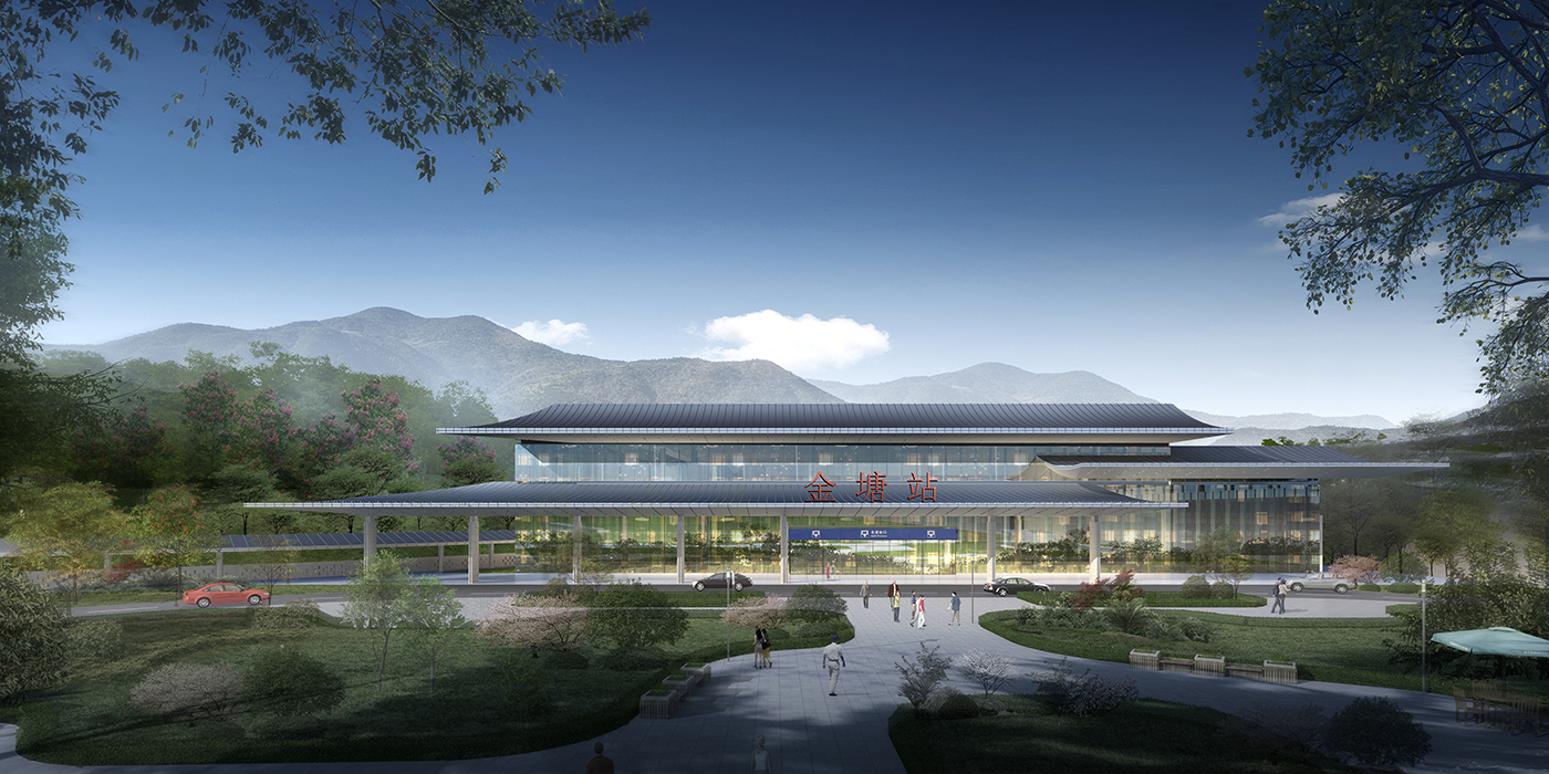 金塘站周边群山叠翠,自然环境十分优越。设计结合车站流线、顺应自然地形,将道路、场地及站房巧妙、自然地设置于环境之中,建立与环境良好的有机关系。