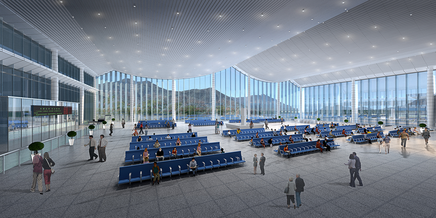 金塘站为线侧下式站房,旅客于南侧落客进入候车厅,经由地道进站。候车厅西侧面向山体环抱展开,将最具金塘特色的自然山水景观展示给旅客的同时,也给旅客带来难忘的候车体验。此外,旅客经由出站通道出站后,通过一条顺应环境的曲线游廊的引导,进入出租、公交等换乘空间,流线便捷清晰,空间富有特色。