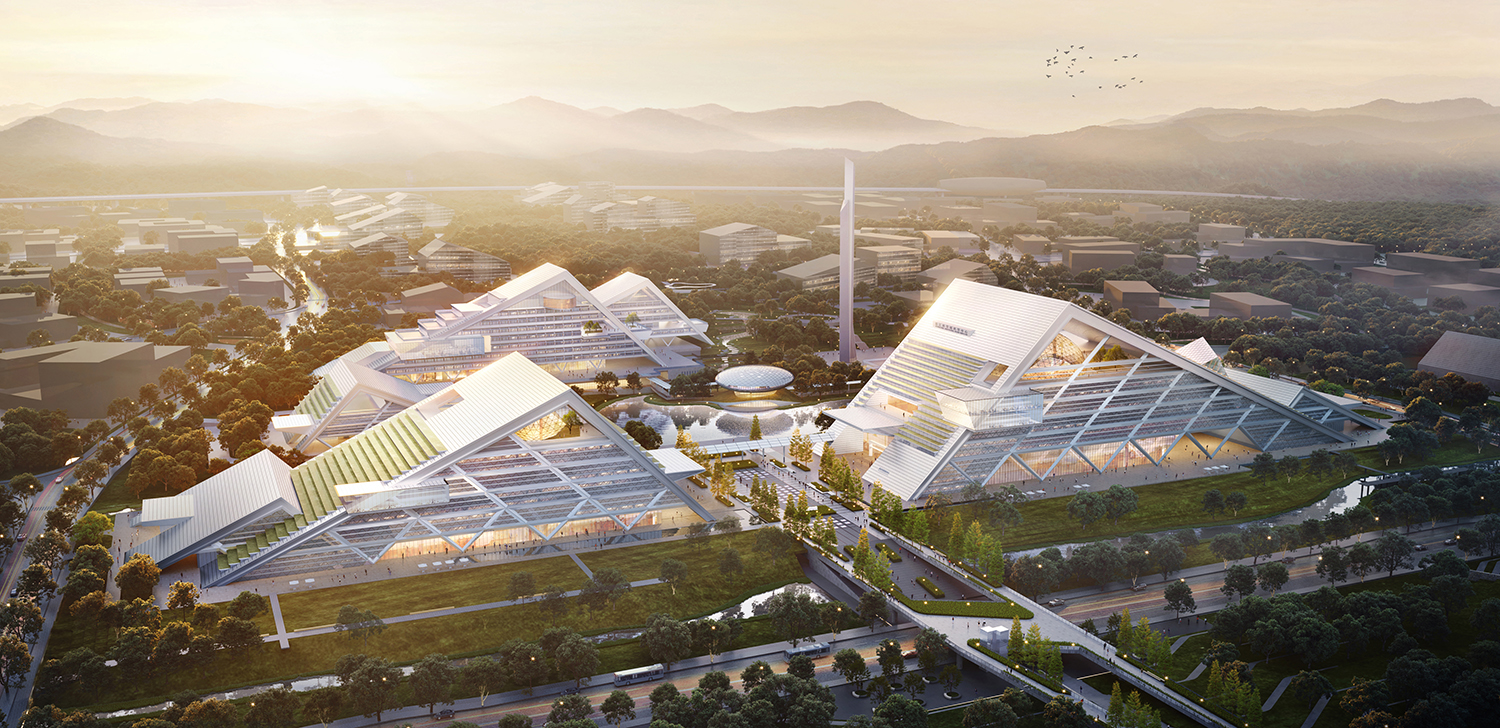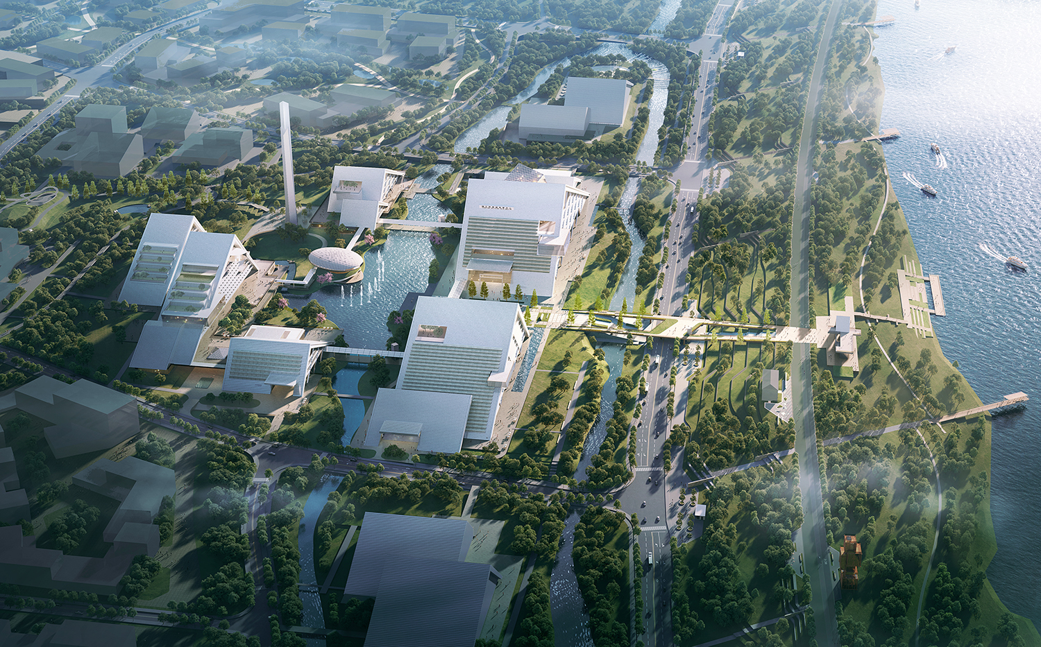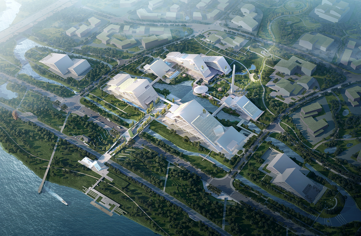 设计通过对湖湘的自然山水、传统建筑、山水画卷等元素抽象、转译与重构,建筑层峦叠嶂,错落有致,整体呈现出“如山枕水,连洲为城”的意境。