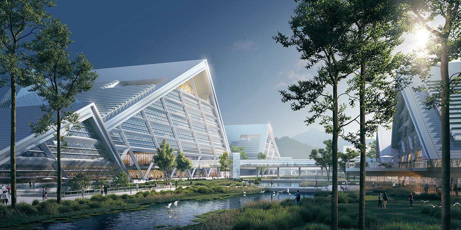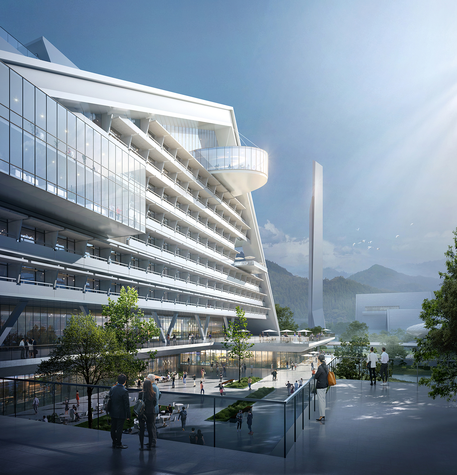 设计将中央绿谷、内湖花园、科创广场、高线公园与城市阳台等与自然山水环境有机融合,形成全天候开放的活力空间。多层次的屋顶露台,可饱览山水景色与城市风貌。水绿交织、望江叠台的室外景观与室内空间相互渗透,打造出多维立体、开放共享的市民客厅。