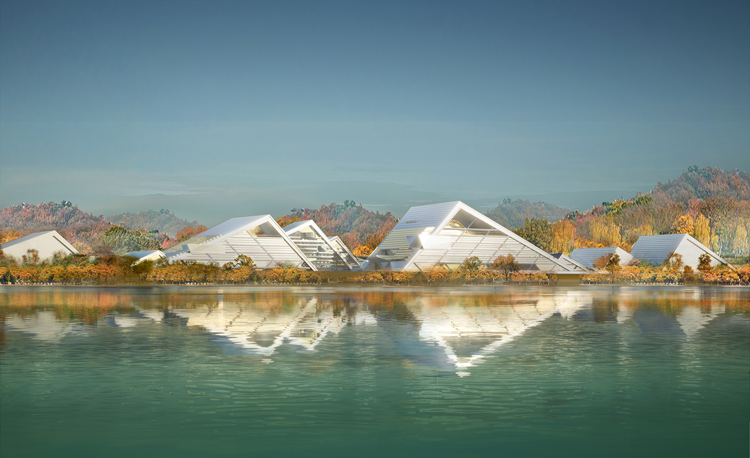 建筑造型以最具神秘性的三角形图案为母题,象征着稳定、力量与未来科技;建筑挺拔的线条与湖南人刚毅精神相契合;不同大小的体块穿插与组合,营造出开合有序、虚实相生的气韵,建筑沿江排开,犹如百舸争流。