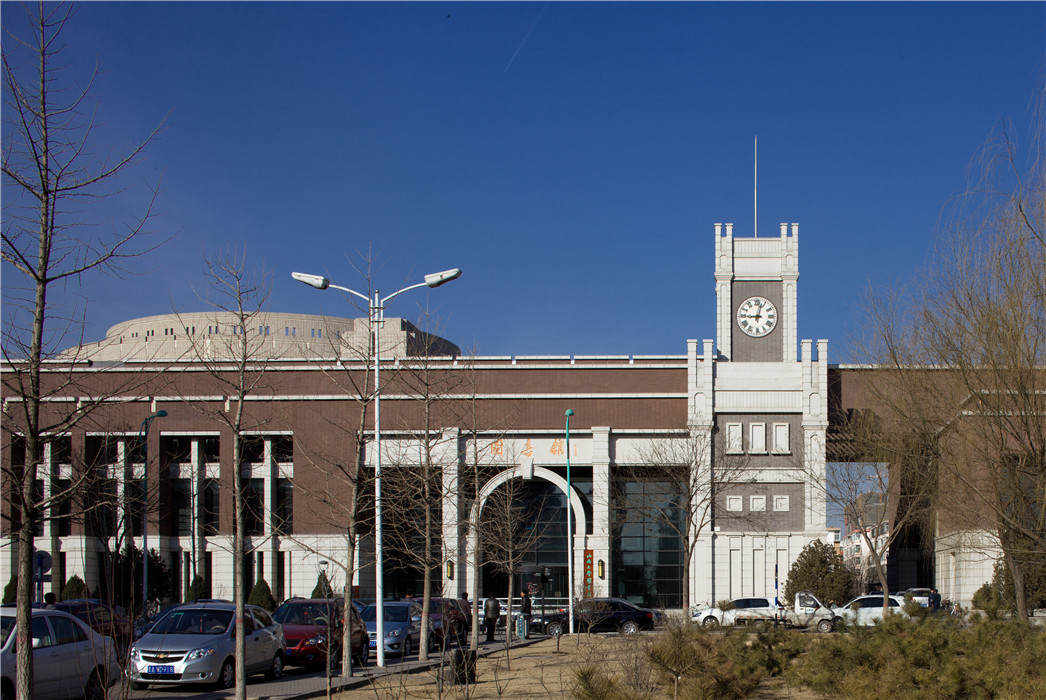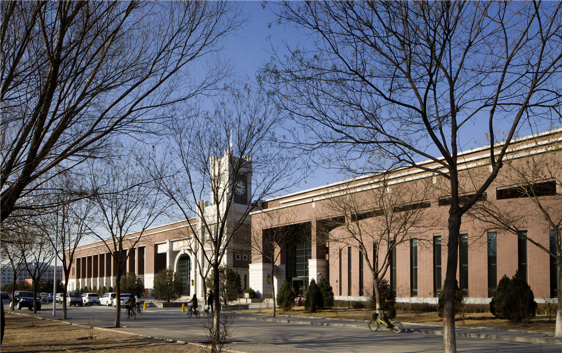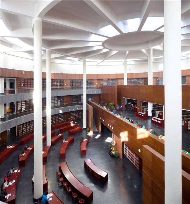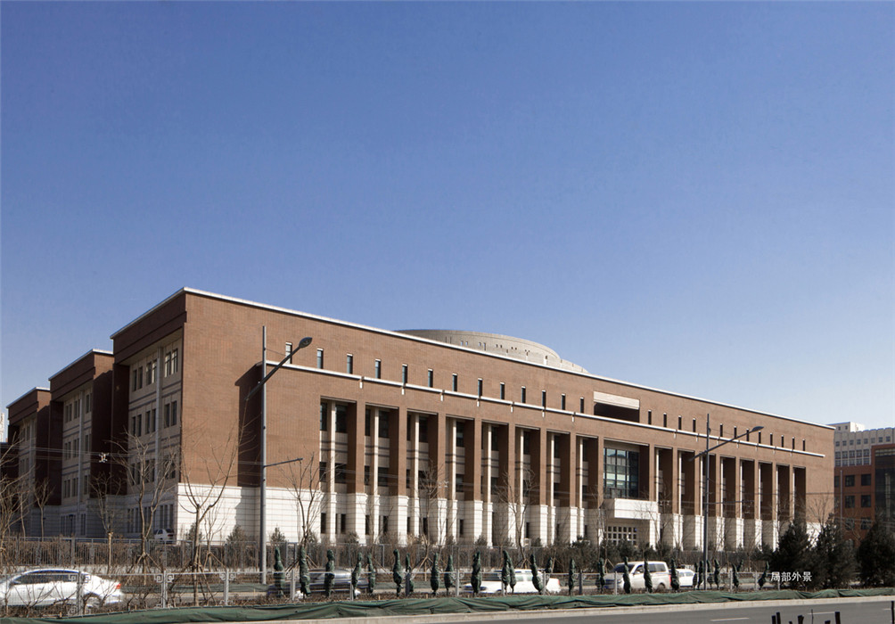 主体材料采用面砖,以暗红色为主,延续整个山西大学的色彩风格,同时也应和学校建筑朴实的特质。建筑基座部分采用石材处理,体现建筑的厚重感和学校深厚的文化底蕴。建筑造型庄重典雅,光影变化丰富,强调立面的韵律,以严谨对称的构图手法突出了学校图书馆的重要地位。