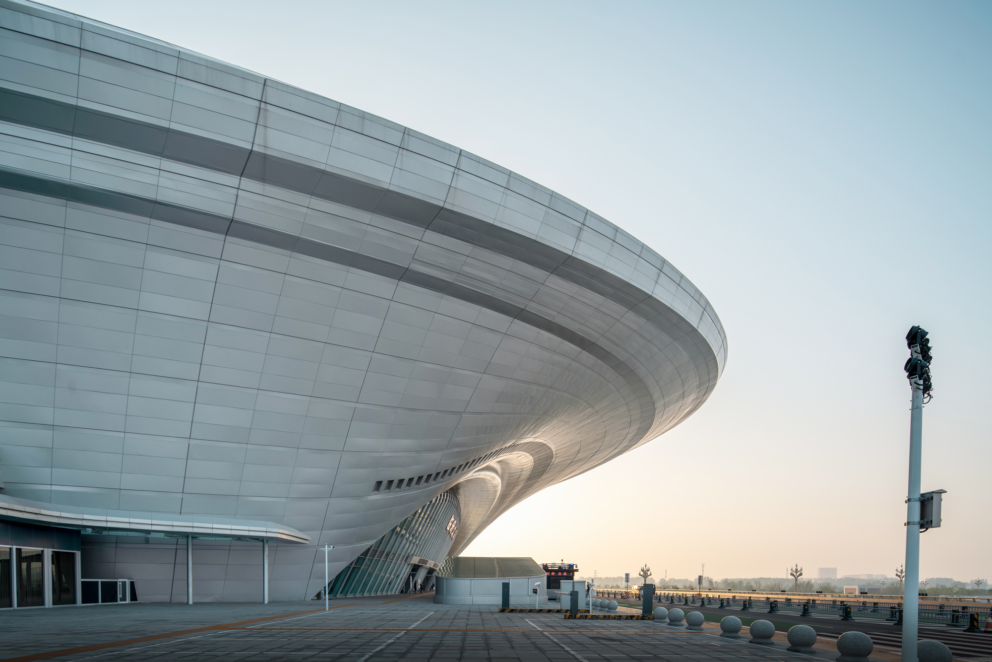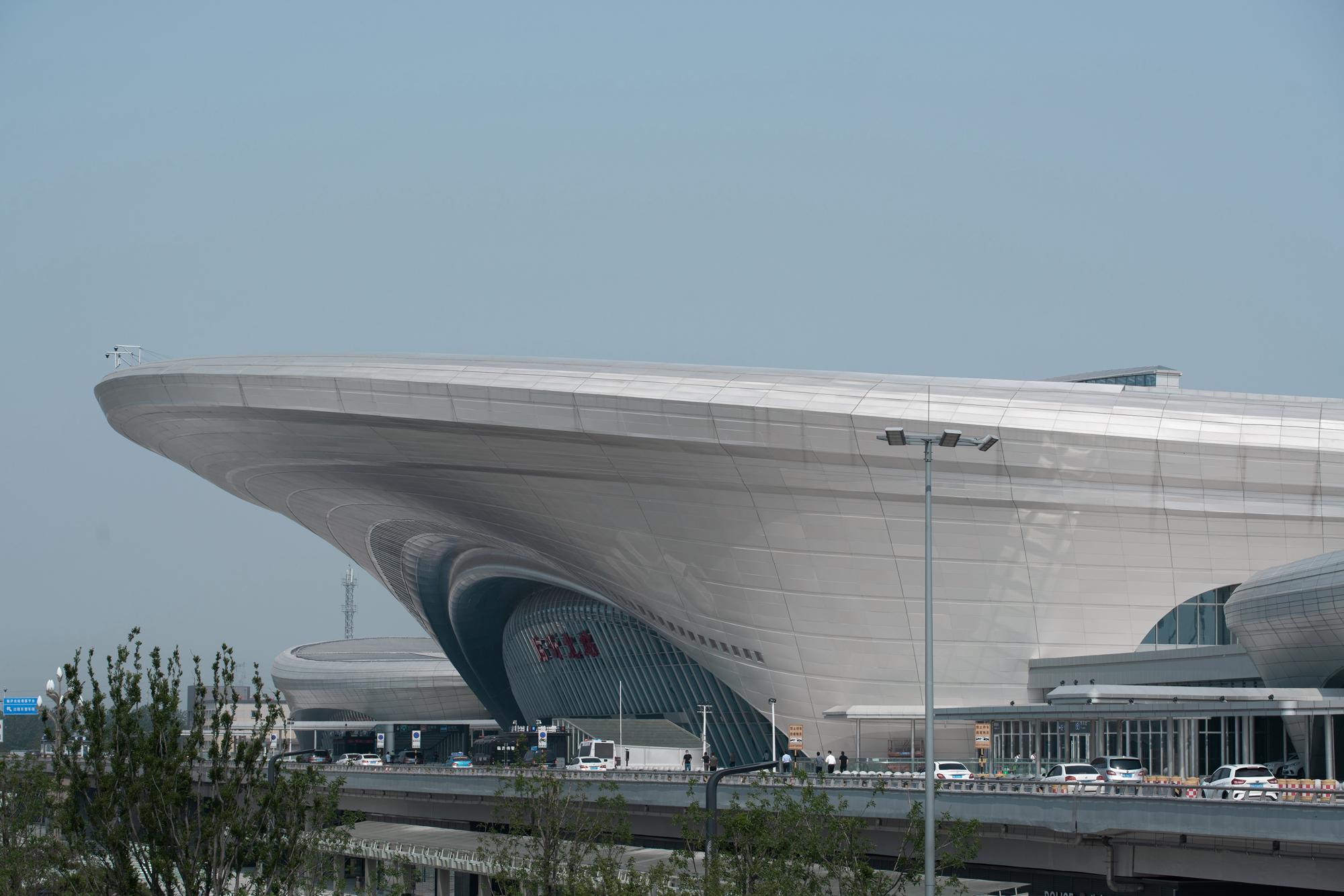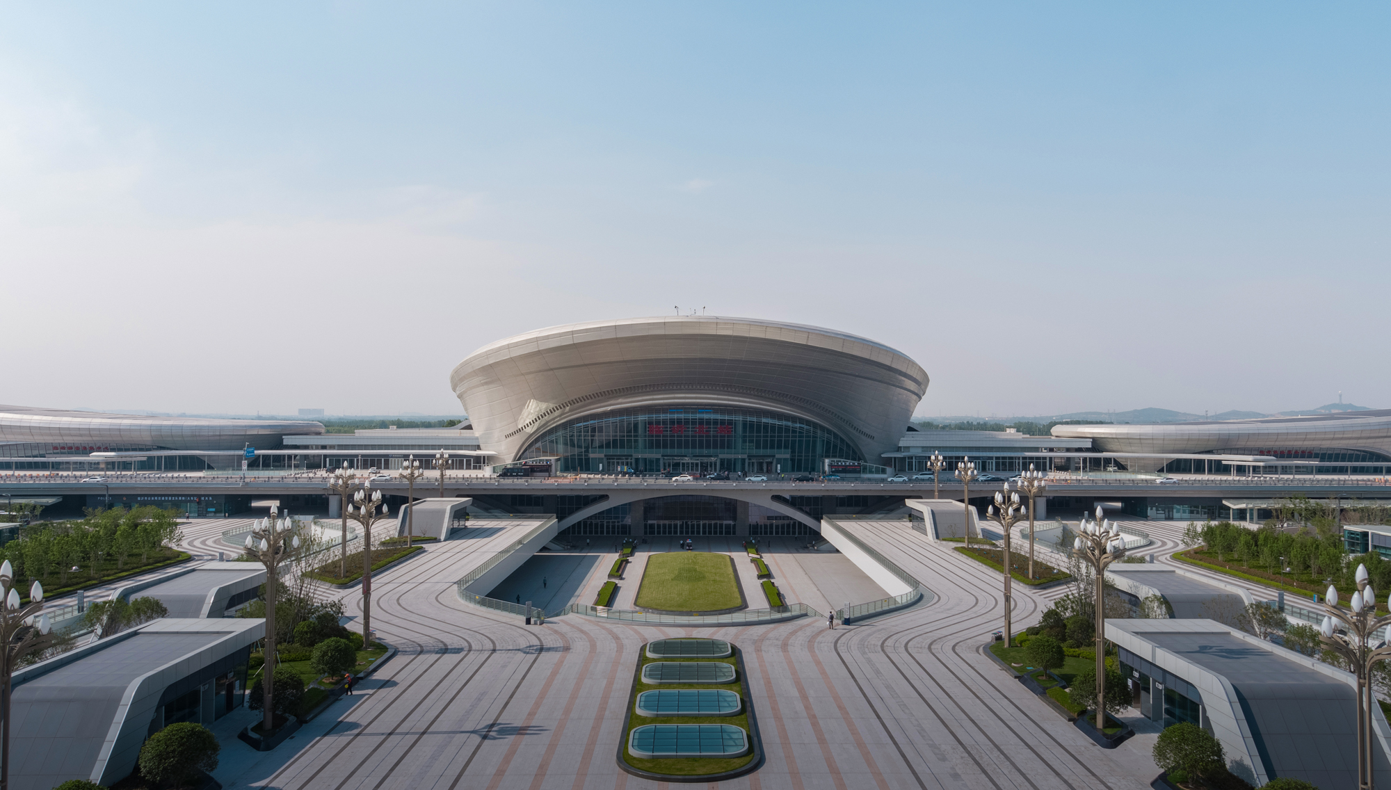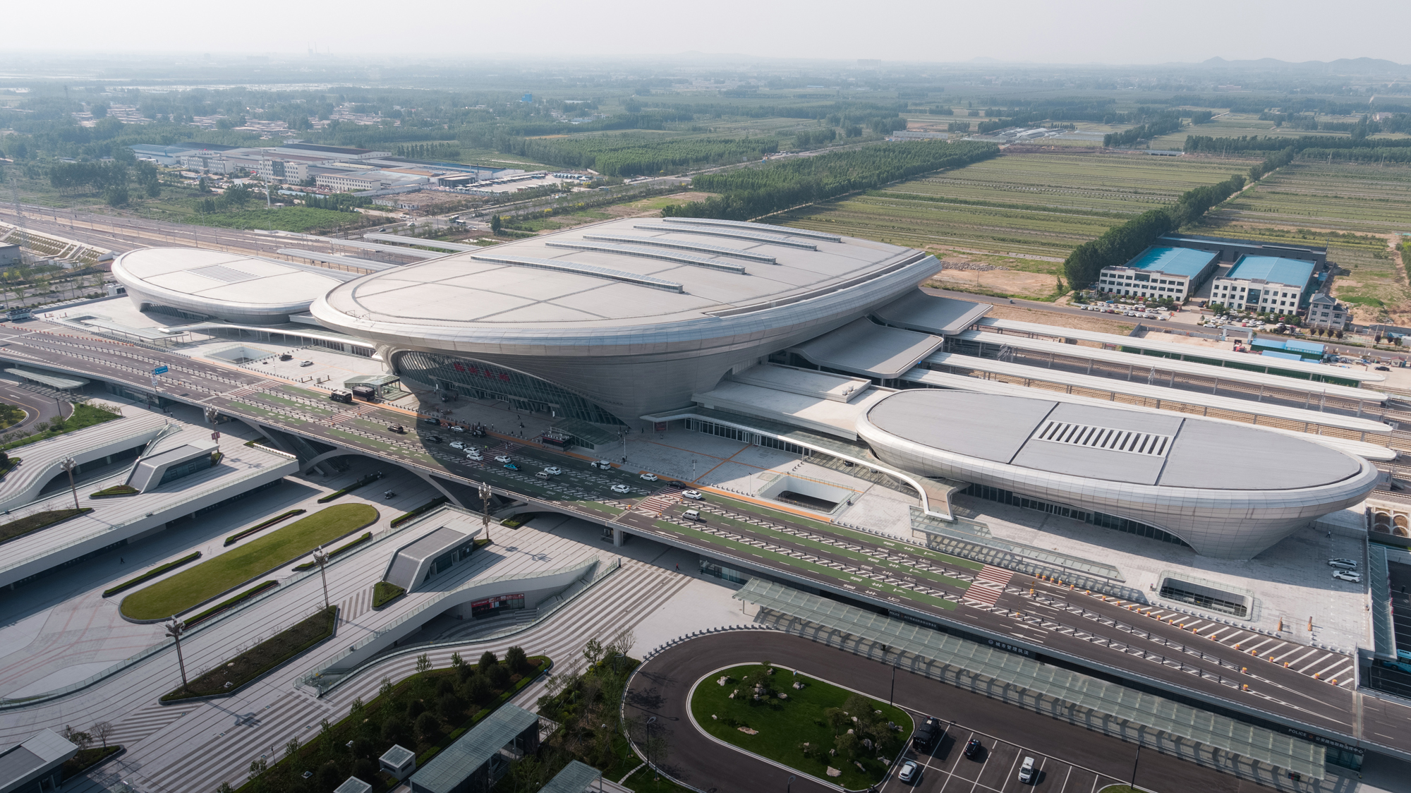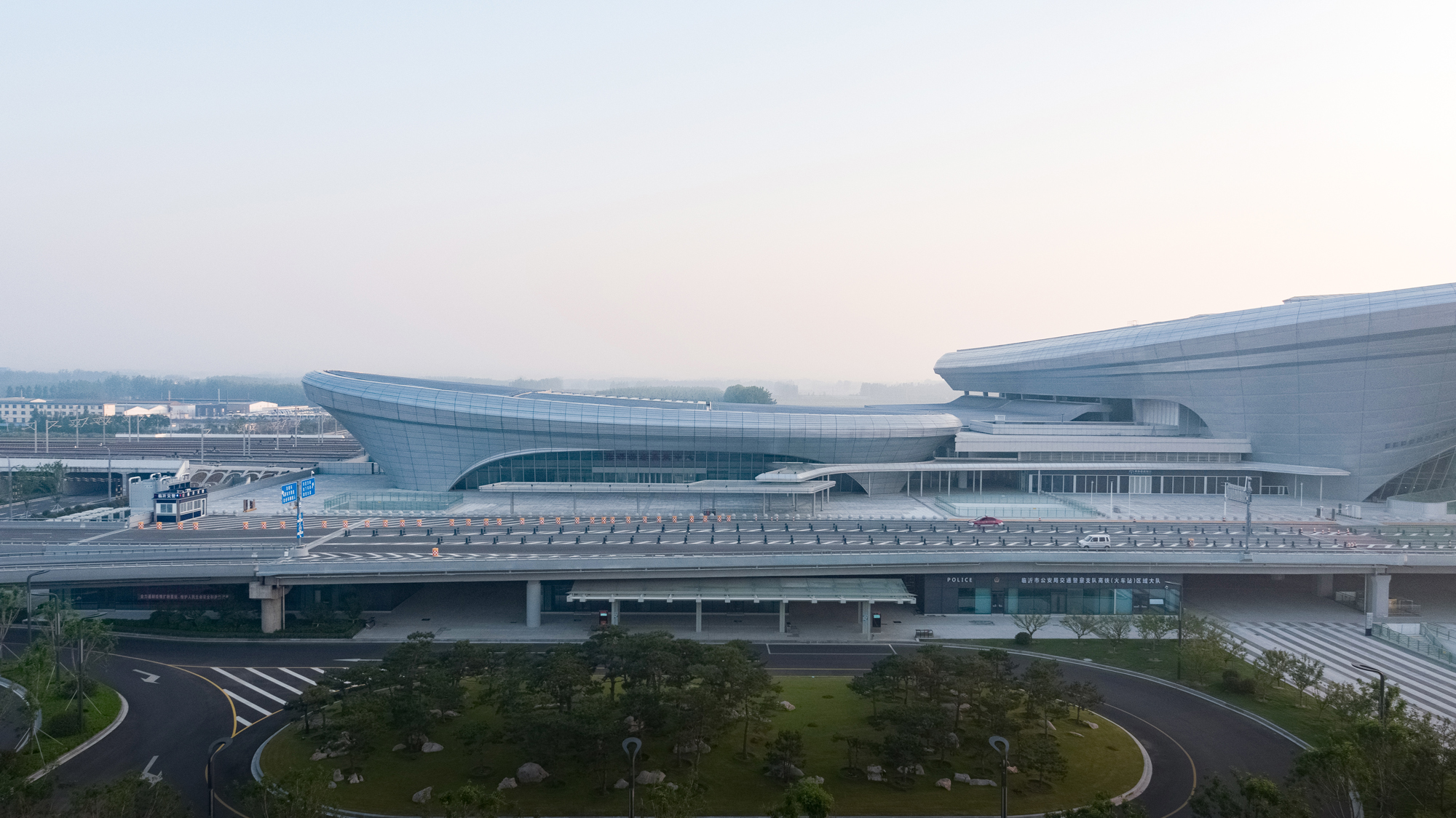 建筑设计以“琅琊新驿、腾飞临沂”为设计理念,整体建筑造型以疾驰的高铁为意向,利用现代设计手法,运用流畅的曲线展现腾飞临沂的面貌,寄寓着城市高速发展的美好愿望,打造富有临沂特色的高铁新城枢纽形象。在总平面设计中,以高铁站房为中心的椭圆形,与周边四处国铁配套用房通过天桥联系,强调站房核心位置及功能,既层次分明又整体连贯,体现临沂市融汇四方的城市魅力。建筑室内形态设计寻求造型与结构的浑然天成,摒弃繁杂的装饰,候车厅吊顶与结构拱桁架走形结合设计,并通过条板、格栅的疏密排布,突出空间通透性和连贯性,将结构之美与建筑之美完整呈现,由内而外渗透出作品的独具匠心,并以此展现临沂追求卓越的城市气质。